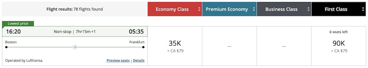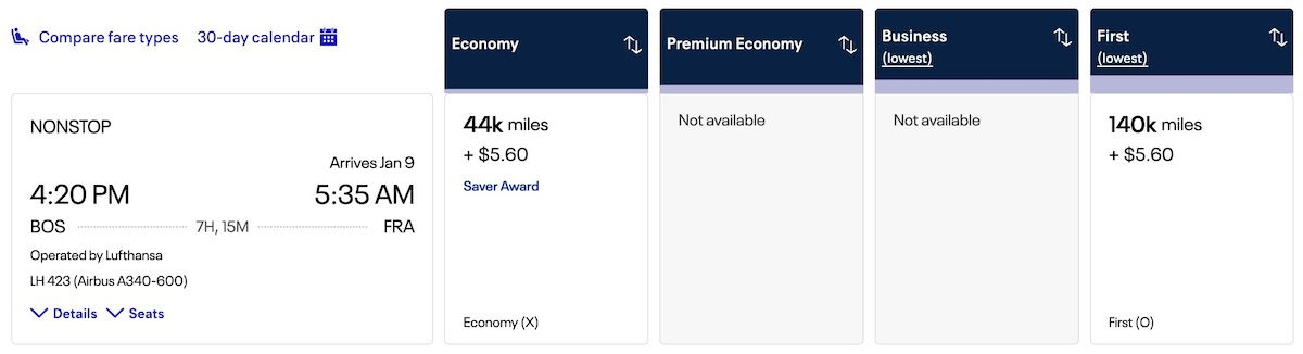 - Lufthansa makes award seats available until the very last minute, so don’t be surprised to see first class award seats made available as late as the day of departure