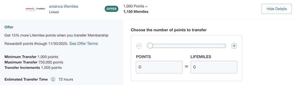Through November 30, 2025, the Amex Membership Rewards program is offering a 15% bonus on points transfers to Avianca Lifemiles. If you’re looking to redeem on Star Alliance partners, there’s definitely some value to be had here.