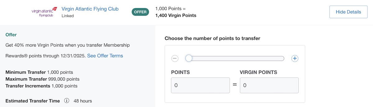 Between November 20 and December 31, 2025, the American Express Membership Rewards program in the United States is offering a 40% bonus on points transfers to Virgin Atlantic Flying Club.