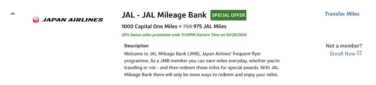In September 2025, we saw the Capital One mileage program add Japan Airlines Mileage Bank as its newest transfer partner. We’ve just seen the program introduce its second transfer bonus to the program since launch, and it could represent a good deal. However, it still won’t quite get you a 1:1 transfer ratio.