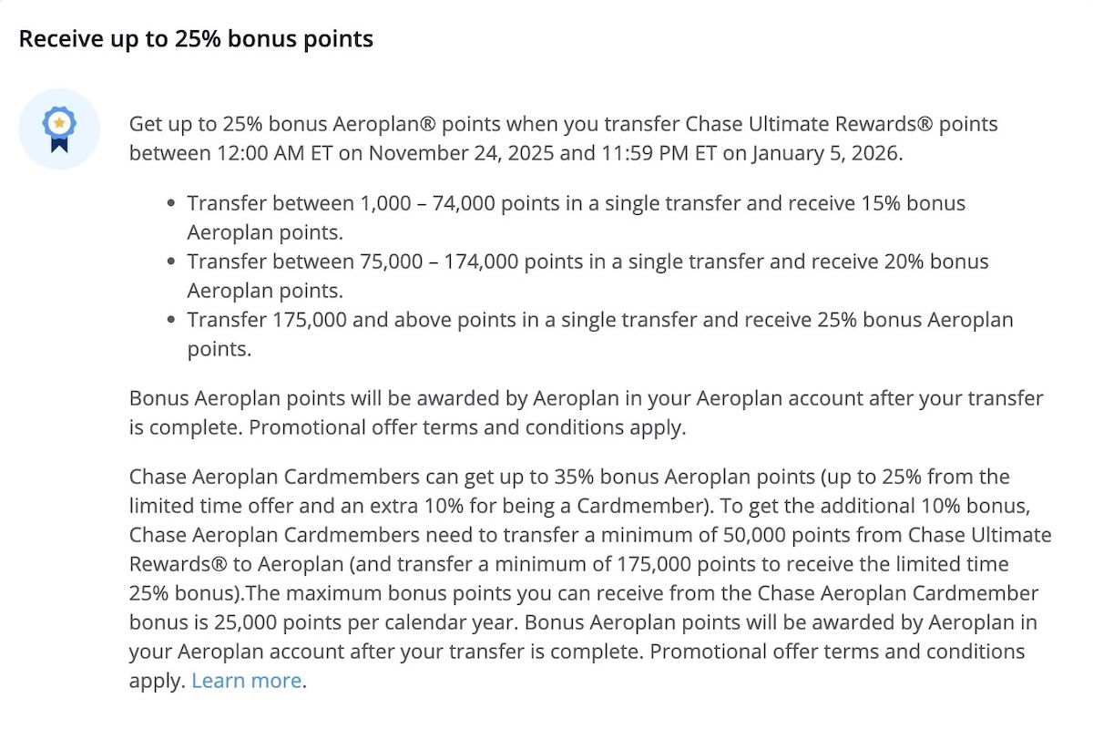 Between November 24, 2025, and January 5, 2026, you can earn a bonus when you transfer Chase Ultimate Rewards points to Air Canada Aeroplan. This is a tiered bonus, so you get a bigger bonus the more points you transfer (which is a unique twist on the typical promo), as follows: