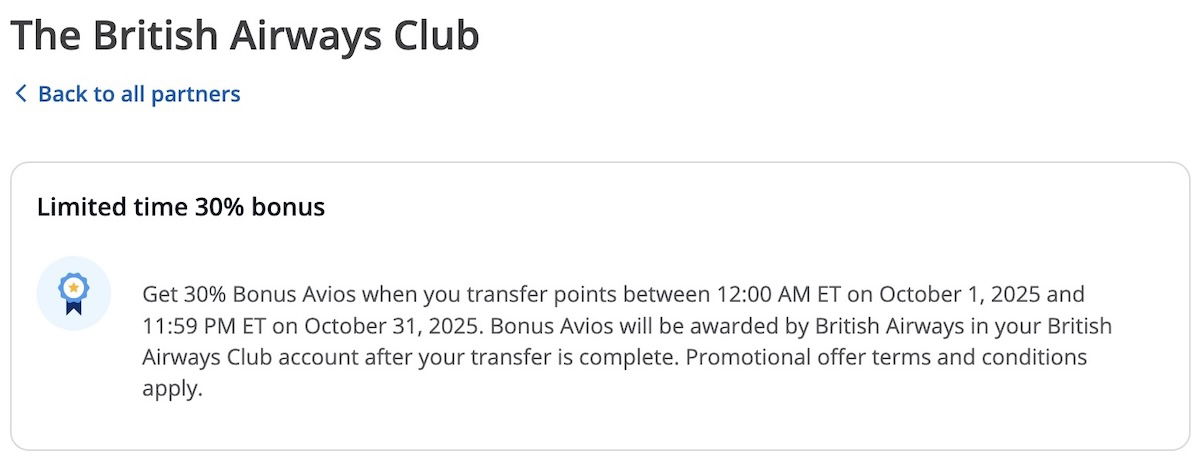 Between October 1 and October 31, 2025, Chase Ultimate Rewards is offering a 30% bonus when you transfer points to British Airways Club.