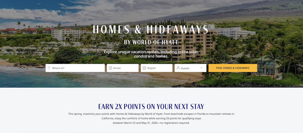 World of Hyatt is offering 2x points on Homes & Hideaways vacation rentals, as flagged by Frequent Miler. There are surprisingly few terms associated with this, as it’s valid for stays that are consumed between March 23 and May 31, 2026. Bonus points will post two to four weeks after an eligible stay.