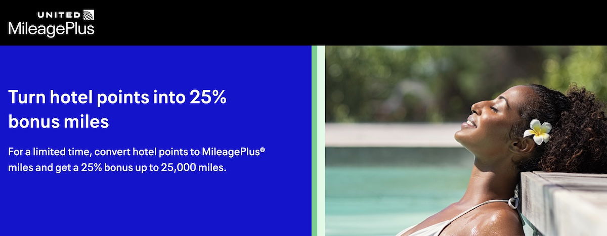 United MileagePlus is offering a 25% bonus when you convert hotel points into miles, and you can earn a maximum of 25,000 MileagePlus bonus miles with this promotion.