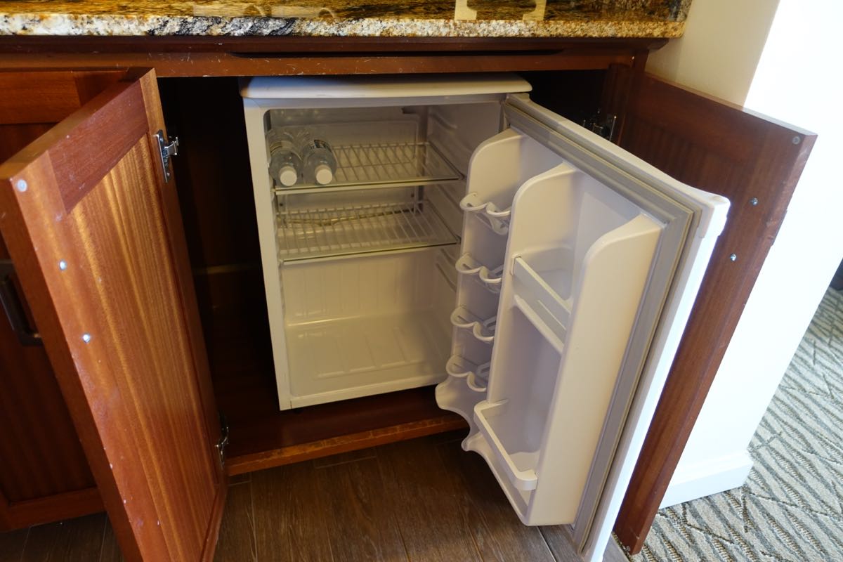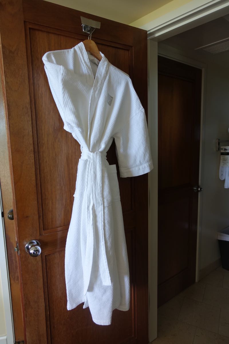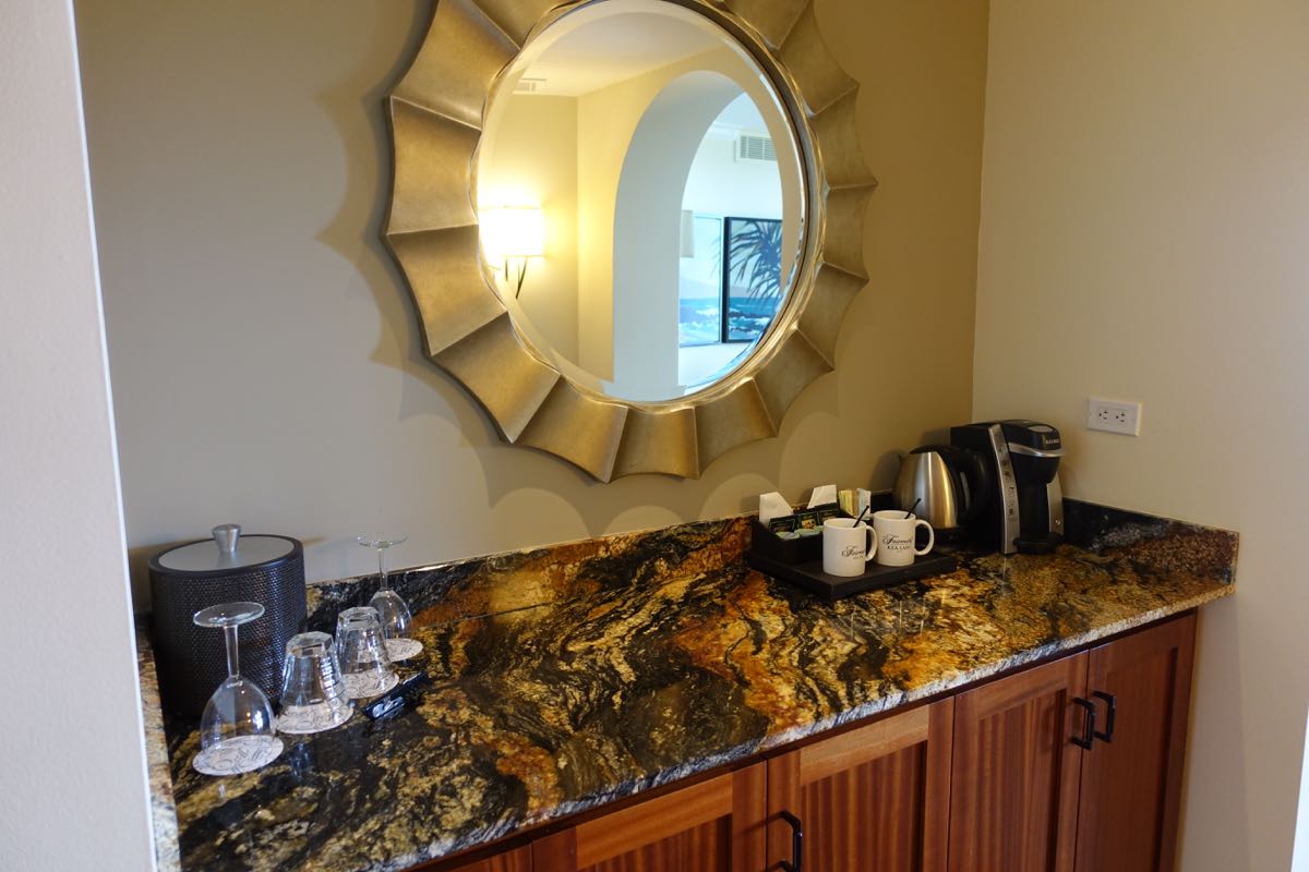 The bar area had a tea and coffee station, as you’d expect, but the cabinet also had a mini-fridge (empty except for two complimentary bottles of water), and a microwave. A family could easily keep a few snacks in their room — we stashed fruit and yogurt in here for early mornings. I thought both were a very nice touch, given how expensive food in Hawaii can be.