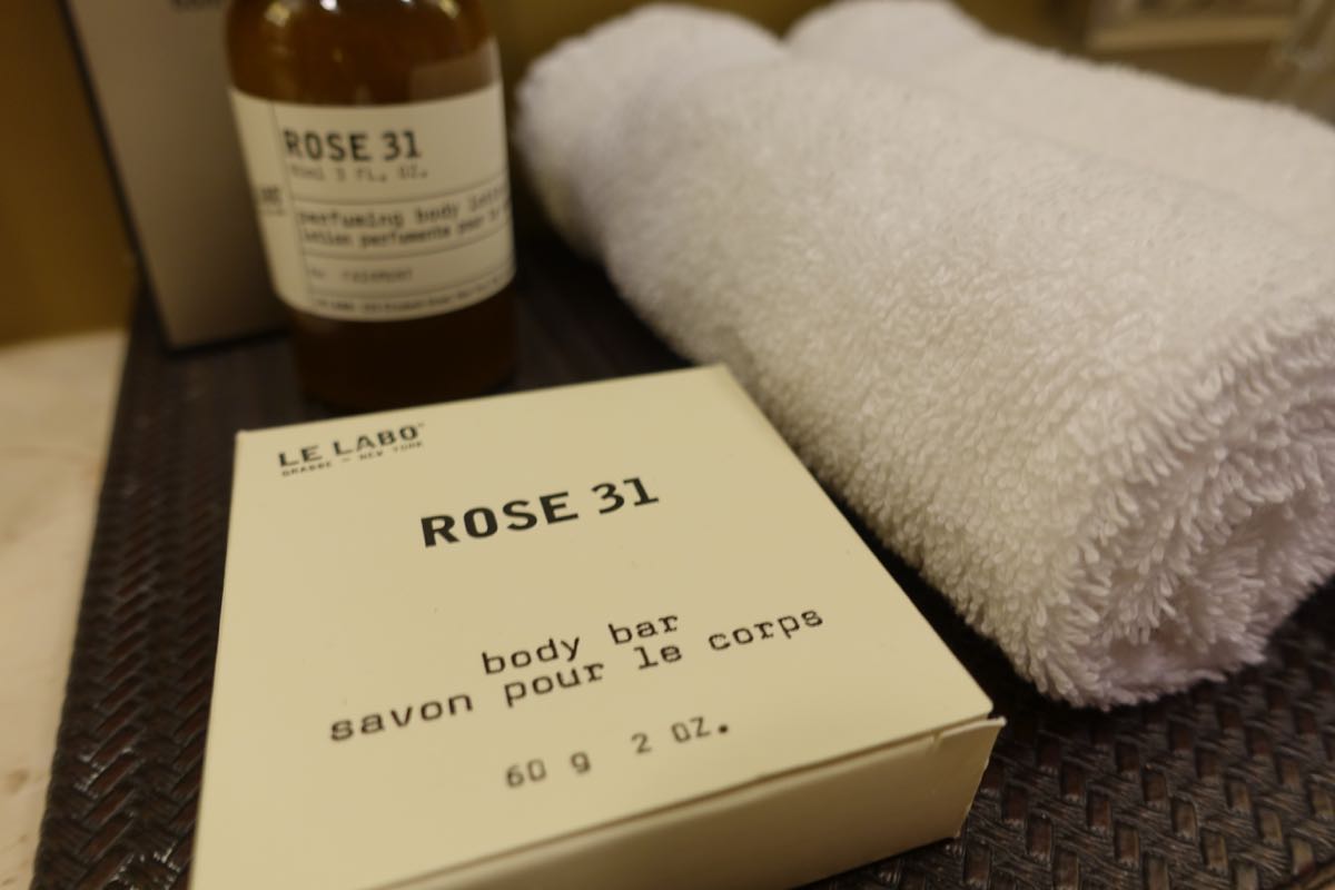 The bath amenities were Rose 31, by Le Labo — Fairmont’s signature scent.