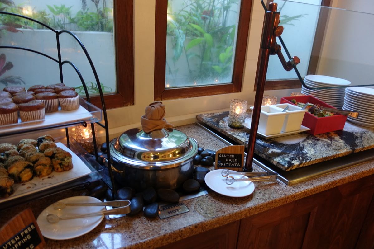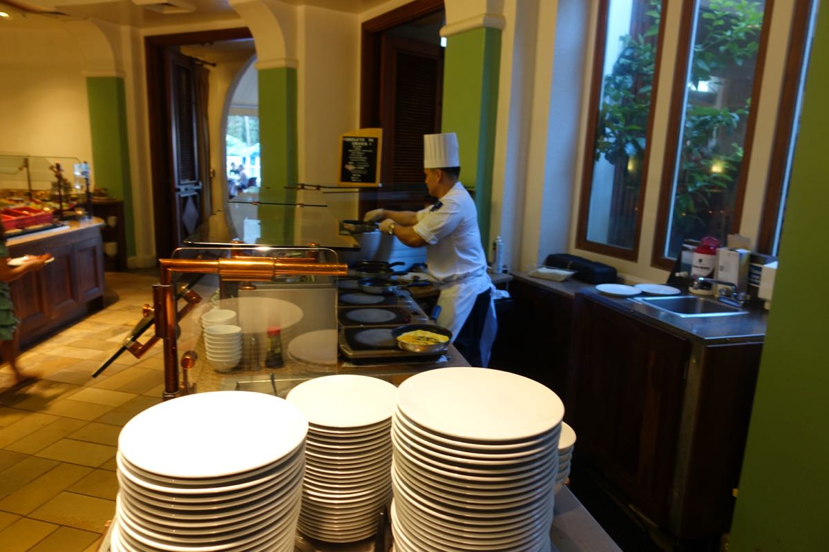 Once inside, sideboards encircled the room, including two islands, creating a narrow figure-eight. Add in the omelet station, people toasting pastries, and staff coming in and out of the kitchen, and it was very cramped, and extremely chaotic. Considering that the Kea Lani has 450 rooms, and most people are probably not traveling solo, the buffet area needed to be at least twice as big.