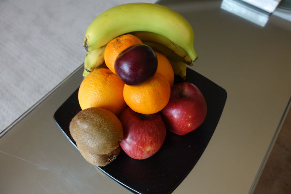 On the plus side, the hotel provided several amenities, including a massive pile of fresh fruit, a box of dates, a bottle of wine, and fresh flowers: