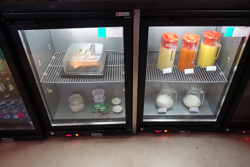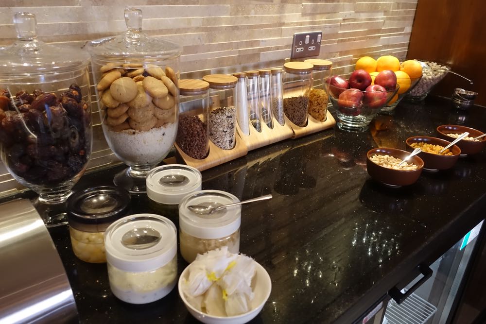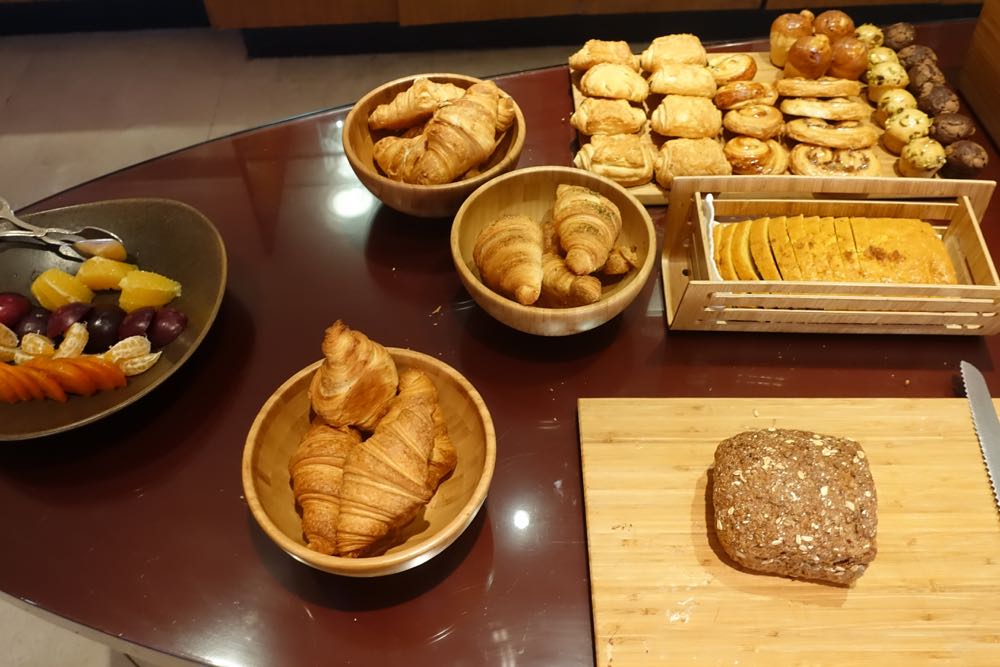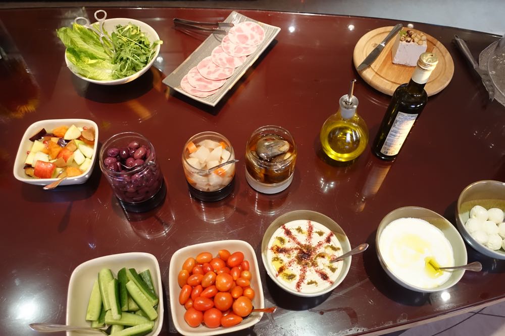 The breakfast spread was impressive, for a lounge, with several types of bread, salad fixings, cheeses, cold cuts, cereals, yogurts, and fruits.
