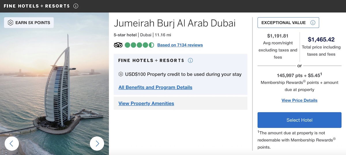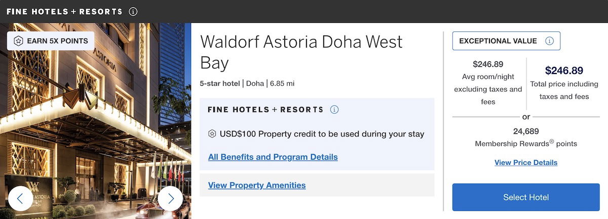 Just to give some totally random examples of Amex Fine Hotels + Resorts® bookings (obviously rates vary by night), you could spend a night at the Waldorf Astoria Doha West Bay for $246.89, so the $300 credit would more than cover that.
