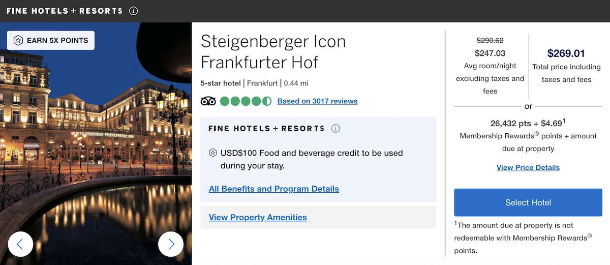 Or if you have an overnight in Frankfurt, you could book the Steigenberger Icon Frankfurter Hof for $269.01, also more than covered by the $300 credit.