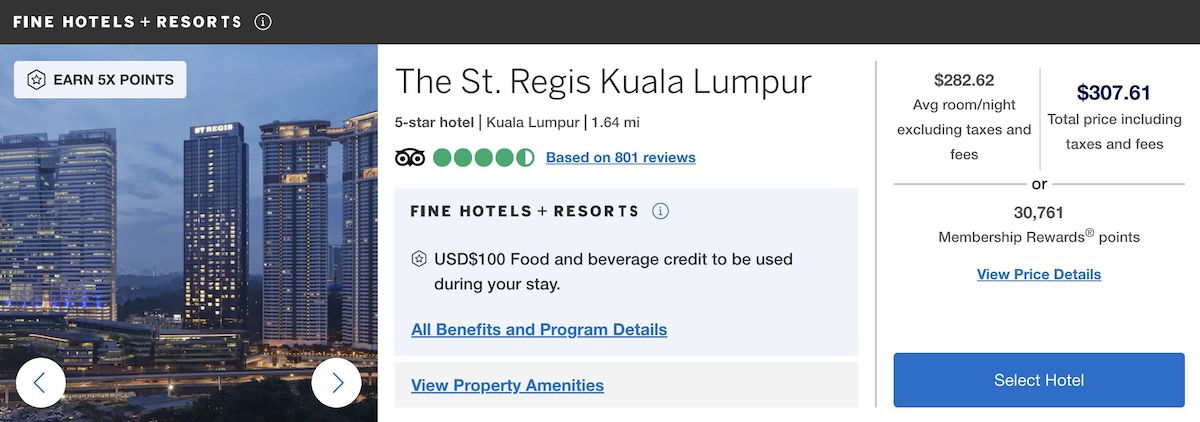 Or the St. Regis Kuala Lumpur can be booked for $307.61, so when you subtract $300, you’re looking at paying $7.61.