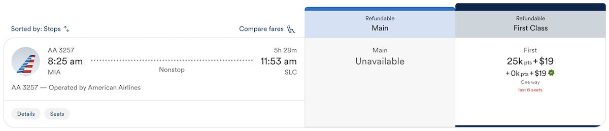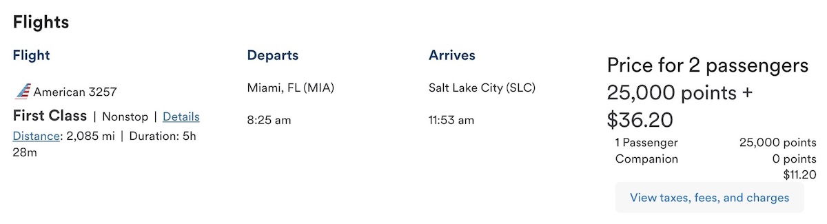 For example, I constantly redeem Atmos Rewards points for travel on American, so I used mine for a first class ticket on American from Miami (MIA) to Salt Lake City (SLC), which costs 25,000 points per person in first class. As you can see, the search result showed that the companion would cost zero points.