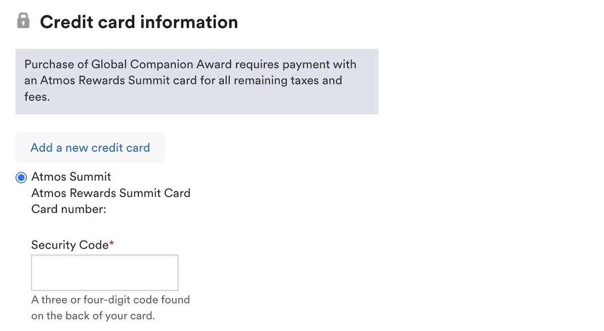 Then when you get to the final booking page, you’ll see a note that the ticket has to be purchased with your Atmos Rewards Summit Card. That’s something you want to do anyway, since it means it’ll waive the $12.50 per person partner award booking fee. So while the initial page showed a cost of $36.20 for both passengers, that price was then lowered to $11.20, thanks to the $25 in waived fees.