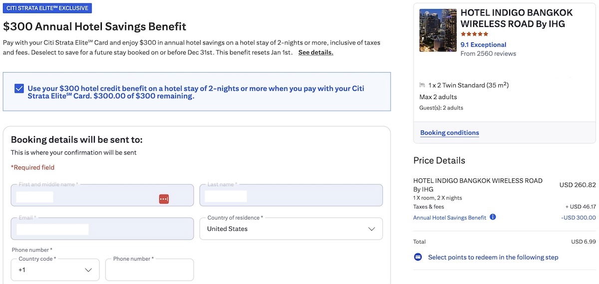 The Citi Strata Elite Card offers several valuable benefits, and among those is a $300 annual hotel credit. This is valid for pre-paid Citi Travel bookings of two or more nights. The good news is that it’s super easy to use, and the $300 credit is applied immediately at the time that you book. It can be used for the primary cardmember or authorized users (and possibly even others, anecdotally?).