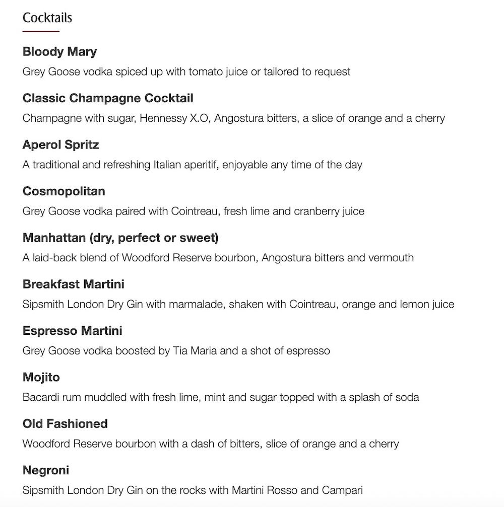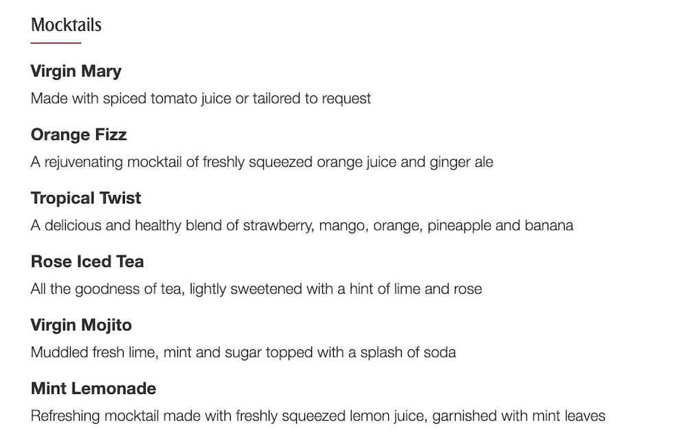 Not only does the airline have great wine, but the bartender can also prepare you just about any traditional cocktail imaginable (these can also be ordered to your seat, for the record). For example, below is the current cocktail and mocktail selection.