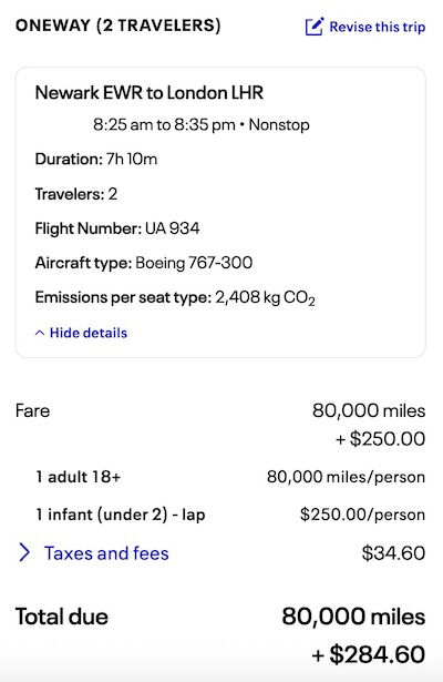 For example, take a one-way business class award for travel on United from Newark to London. As you can see, the cost to add an infant is exactly $250, including all taxes & fees.