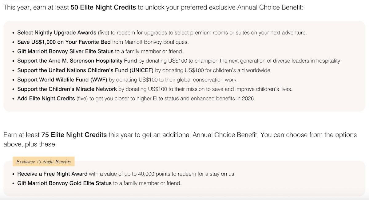 Then Marriott Bonvoy members who pass 75 elite qualifying nights in a year can choose from the following rewards (as you can see, this offers two elevated choices):