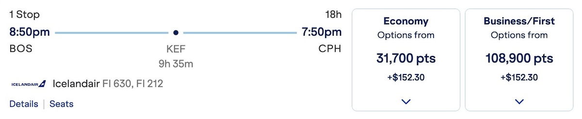 Meanwhile you could fly from Boston to Copenhagen via Keflavik for 31,700 points in economy, or 108,900 points in Saga Class.