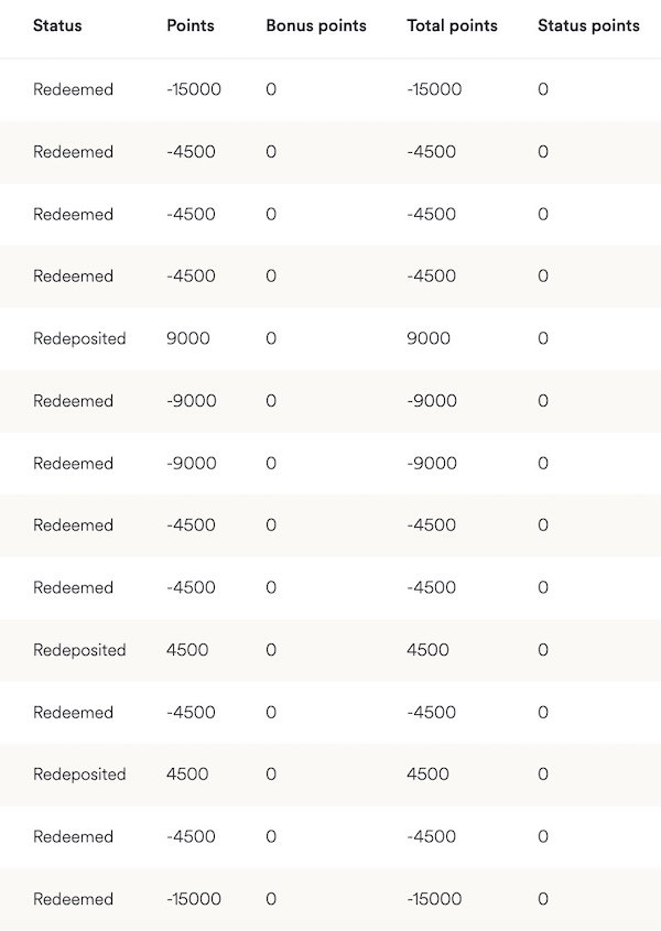 A vast majority of my redemptions are in the first two distance bands, so either covering up to 700 miles (4,500 points in economy, 9,000 points in business class), or covering 701-1,400 miles (7,500 points in economy, 15,000 points in business class). Below is my Atmos Rewards activity for the month of April alone.