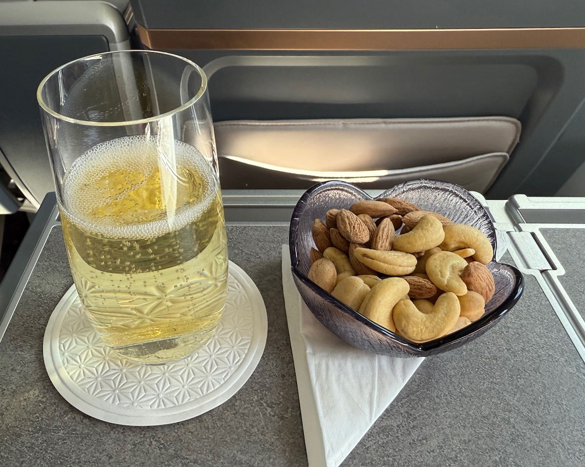 I found the catering setup on this flight to be interesting. On the one hand, it was very similar to the long haul flight, with menus and drink lists being distributed. The drink list was even identical to the A350 flight, including Laurent Perrier champagne being poured at the seat, which was a nice touch.