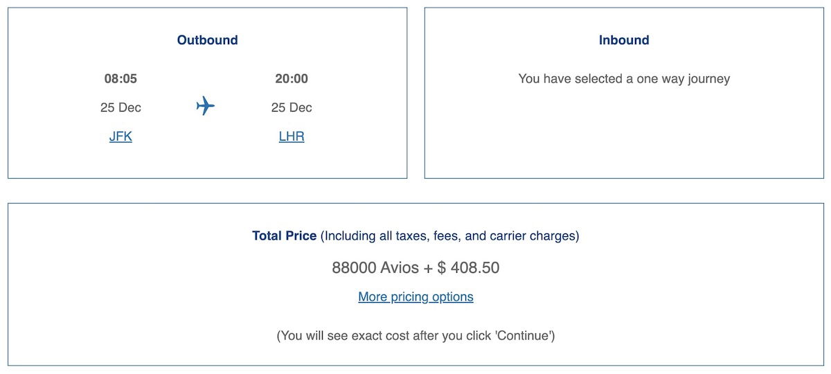 For example, a New York to London Club World (business class) award might cost you 88,000 Avios plus $408.75 in taxes and fees.