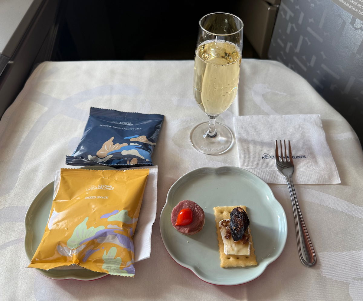 As is the case on all three Taiwanese airlines, the meals are absolutely massive. The first meal began with drinks, an amuse bouche, and two types of packaged snacks. I had a glass of champagne to drink, and China Airlines serves Laurent-Perrier Brut Millesime 2015 on US routes, which is pricey.