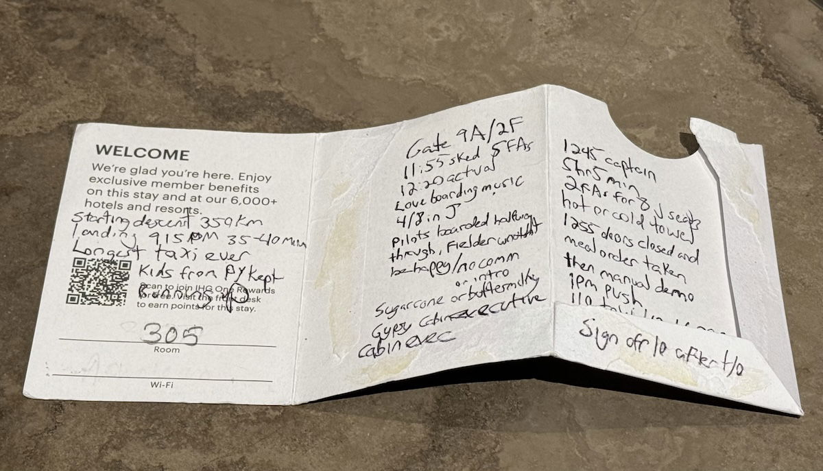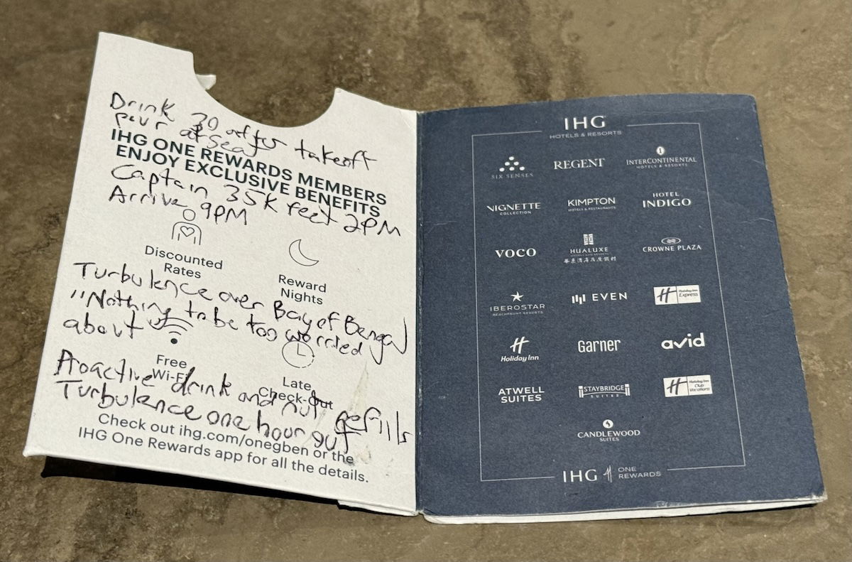 Here’s something else people may get a kick out of. Usually I take notes about flights on my iPhone, but in order to preserve battery life, I instead took notes the old fashioned way. The thing is, I didn’t have a proper piece of paper, so my flight notes were instead taken on the key packet for the Holiday Inn Express transit hotel. Pardon my absolute chickenscratch, as I never handwrite anything, but here you have it, unfiltered…
