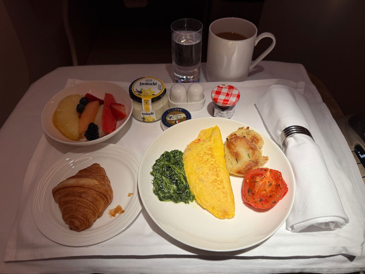 The main meal was then breakfast, and of the choices, I opted for the cheese omelet with spinach and potato cakes. It was also served with a side of fruit, yogurt, and a selection from the bread basket.