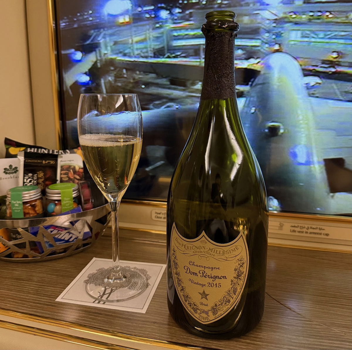 I didn’t have anything to drink prior to boarding (I wanted to save my tolerance), so of course we kicked off the flight with a glass of Dom Perignon 2015, as soon as we got onboard. And boarding took a while, so I was proactively poured a refill. And while going to the bathroom, I noticed that there was yet another refill. Oops.