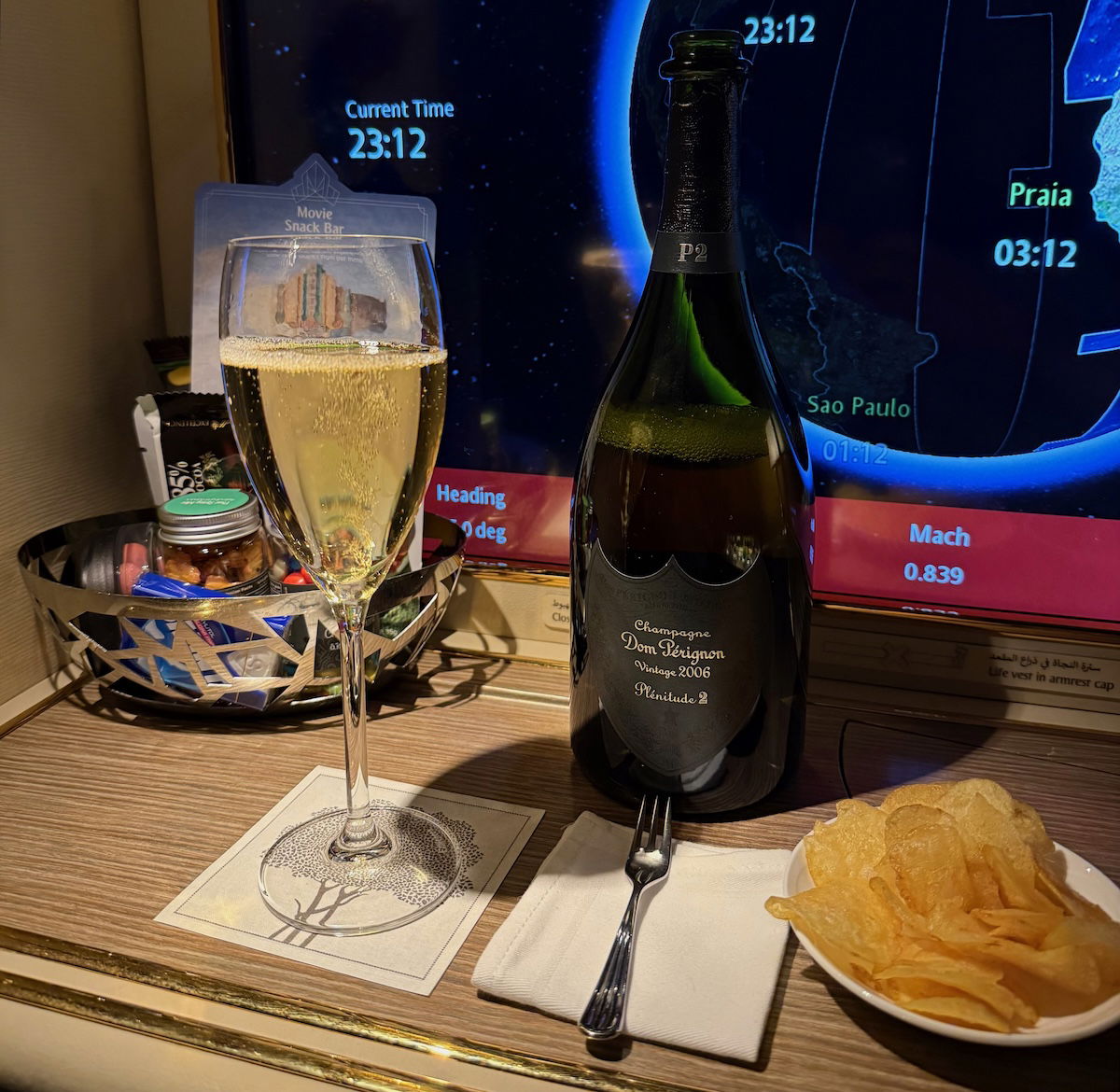 Okay, I figured that would be it for champagne, but after takeoff, I was informed that they also had Dom Perignon 2006 P2 loaded (which couldn’t be served on the ground). That retails for more than double the cost of the Dom Perignon 2015, so it would be rude not to have a glass, right? After all, I have fuel surcharges I need to offset, for mental accounting purposes. 😉