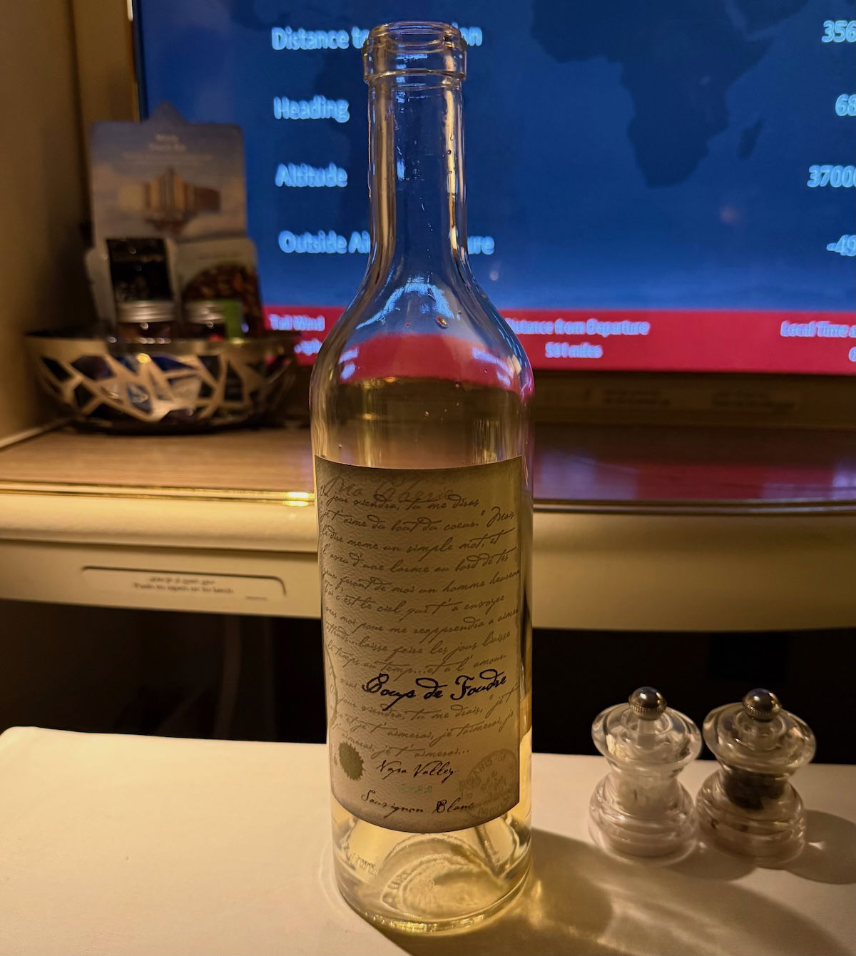 Ummm, so… the flight attendant gave us wine-sized pours of the cognac, rather than just small shots. Case in point — below is what the bottle looked like after we were each poured a glass. JKLRJASLKRETEJKORD!