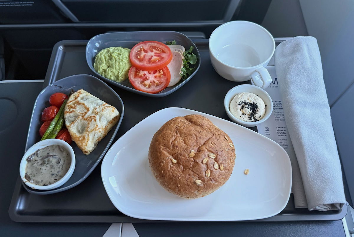 On the flight from Reykjavik to London, the breakfast menu included both the bread roll and the crepe but we were only served the bread roll (and ham, guacamole). I assumed the menu was a choice that we weren't offered but now I see that we were just short-changed! I was unaware that it's possible to pre-order non special diet meals.