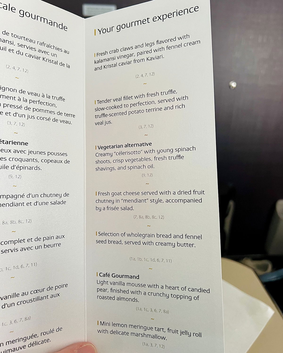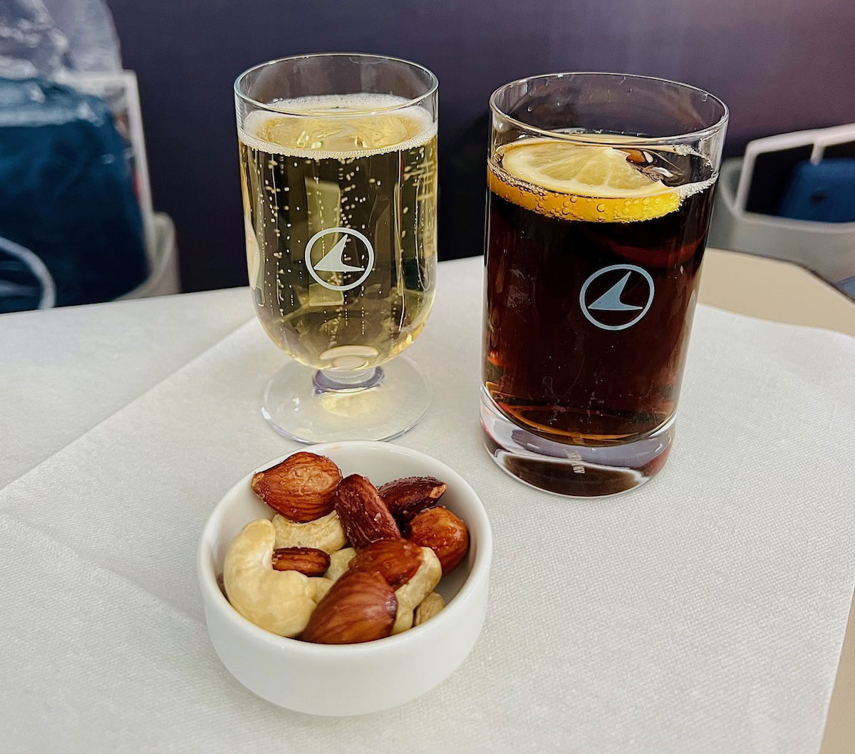 I loved the fact that they had some local wines on offer, and especially some options that felt upscale compared to what legacy carriers offer in business class nowadays. The only option that you could choose regarding the meal was the main course (beef or vegetarian option), leaving you with the caviar and seafood starter even when you opt for the “vegetarian alternative” – so one should definitely order a special meal if an all vegetarian meal is preferred.