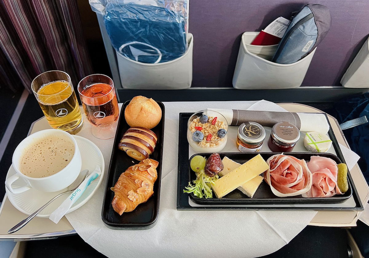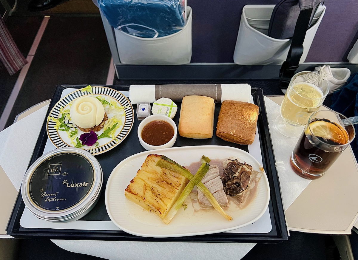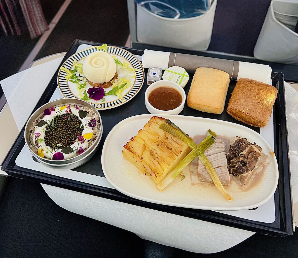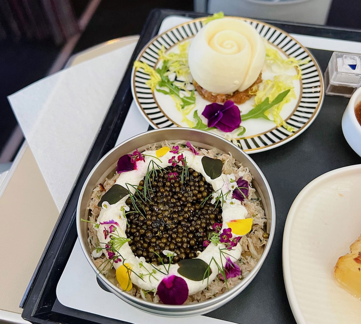 Thanks for sharing! That really is some of the nicest airplane food I've ever seen. Standouts for me include the viennoiseries, bread rolls, cheese course, caviar, and dessert(s). This really does look like food you would find in a highly regarded restaurant or bakery. Feels like there could be some small improvements made to presentation, stemware, and amenities (such as a better pillow).