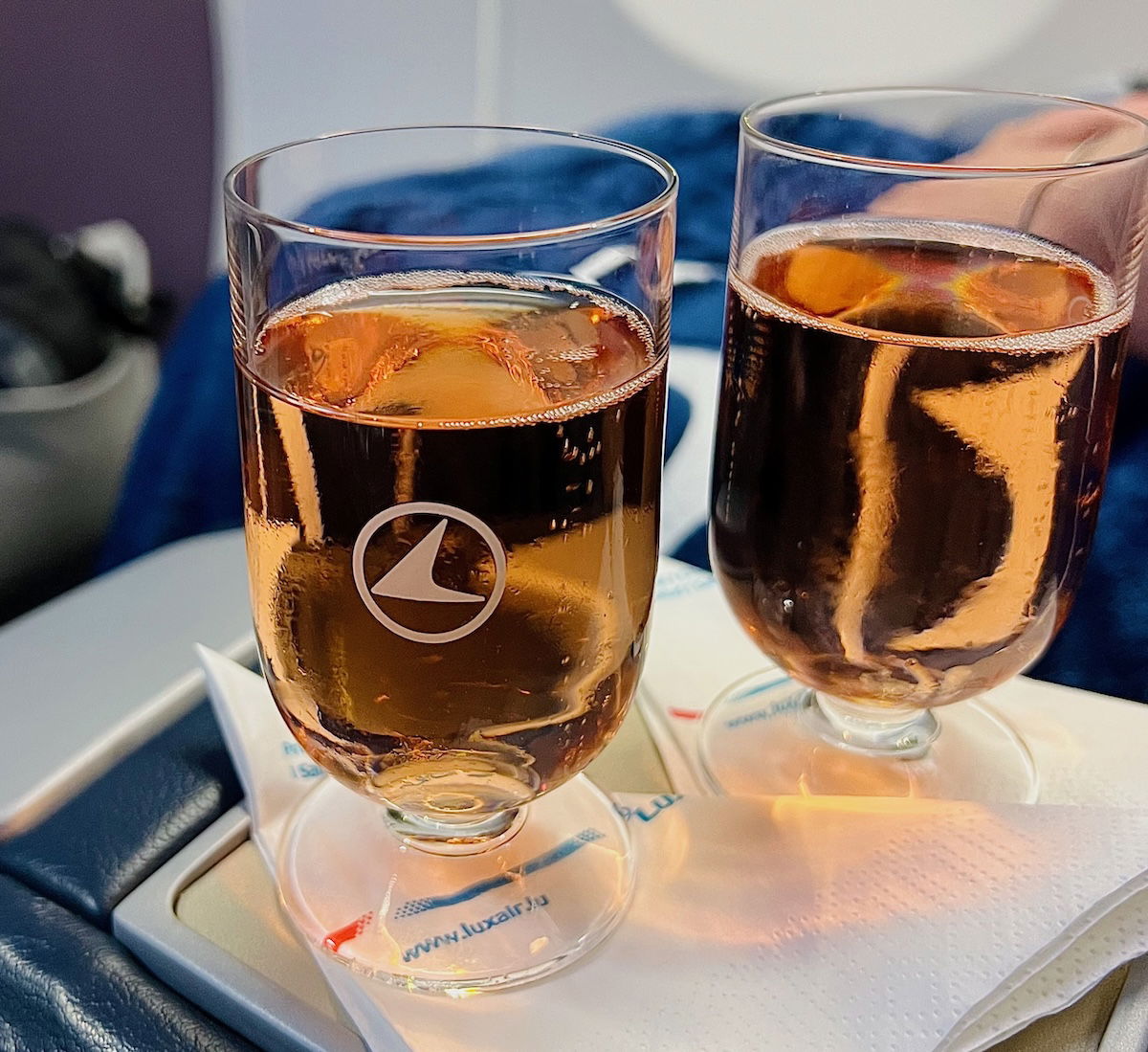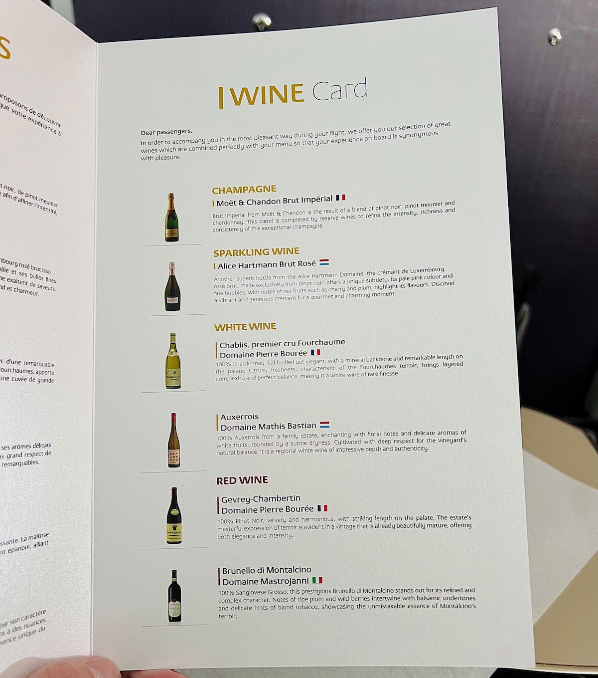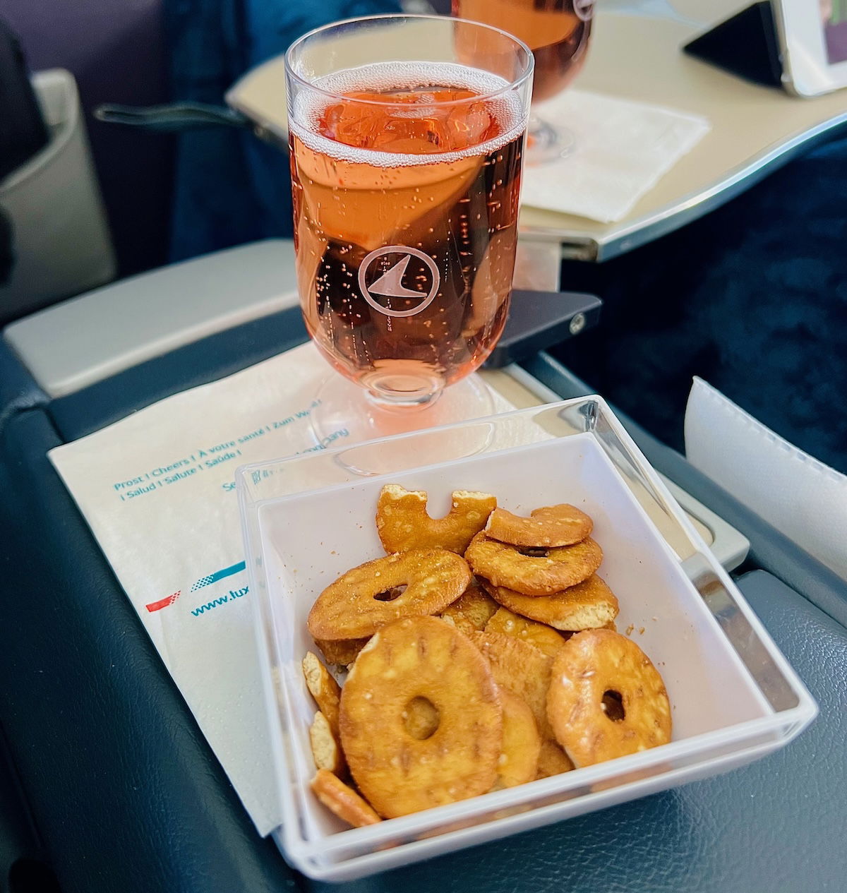 After settling in, we were provided a choice of water, orange juice, or Rosé sparkling wine (I loved that the FA pointed out the fact that they have Alice Hartmann Brut Rosé on offer today while providing the welcome drink, rather than just “sparkling wine”).