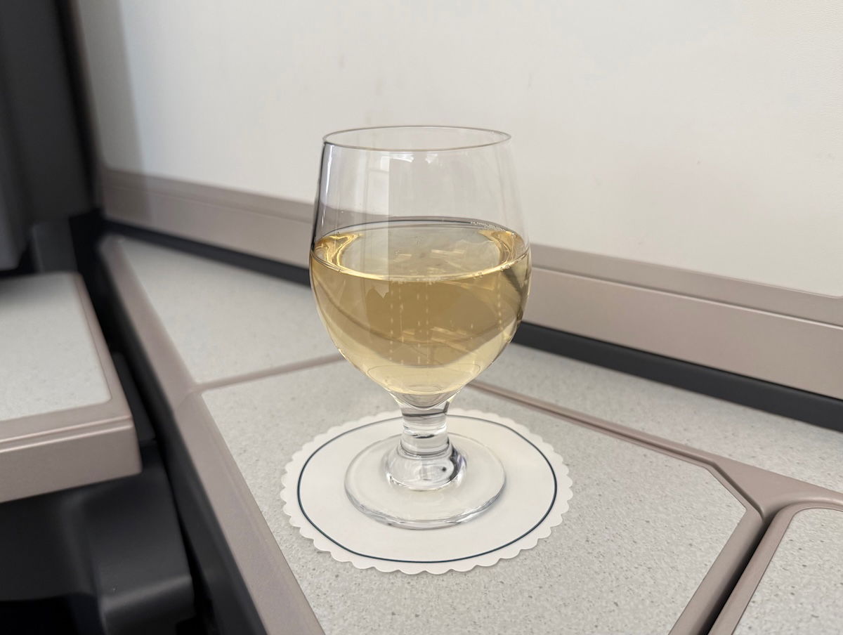 Not only that, but a flight attendant then came through the cabin with a bottle of champagne and glasses, offering to pour each passenger a glass — what a nice touch! Christian Naude was the champagne on offer, for what it’s worth.