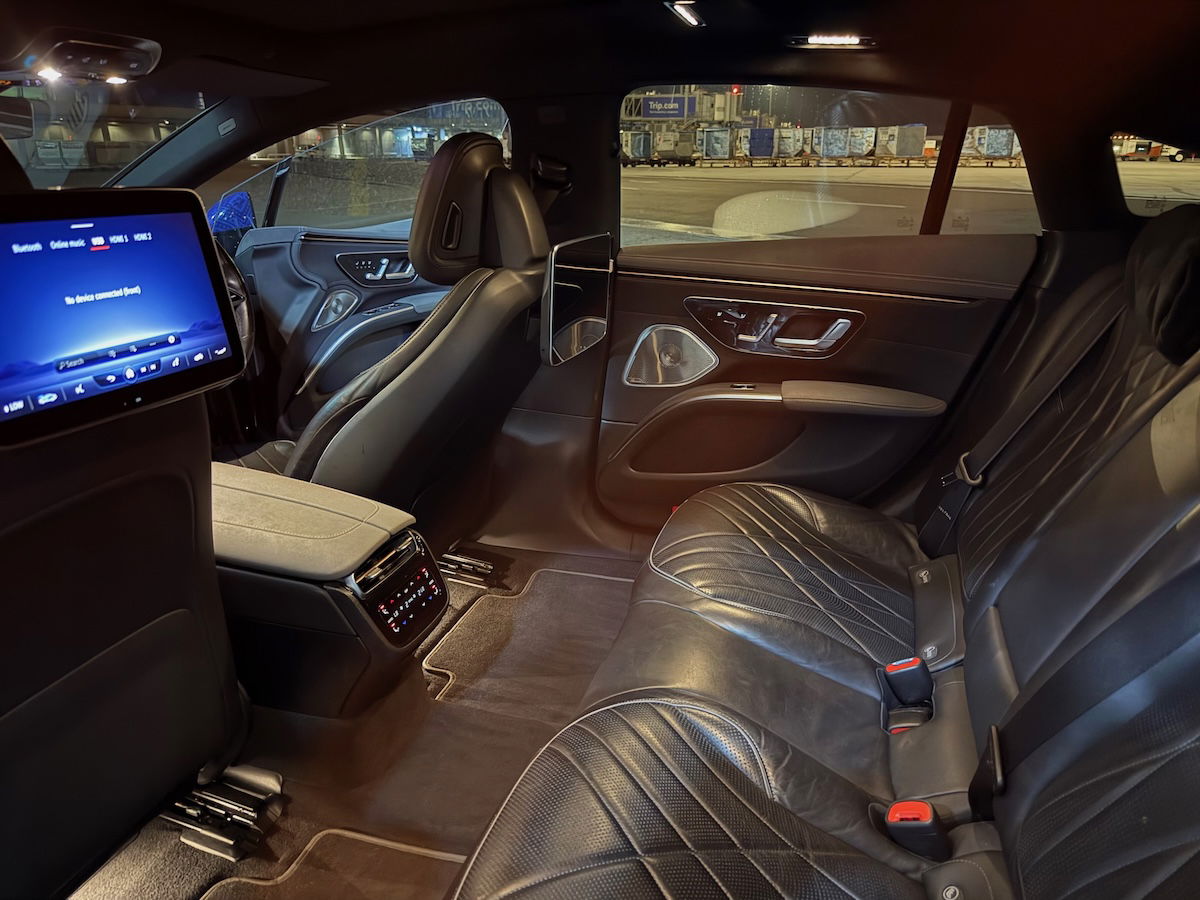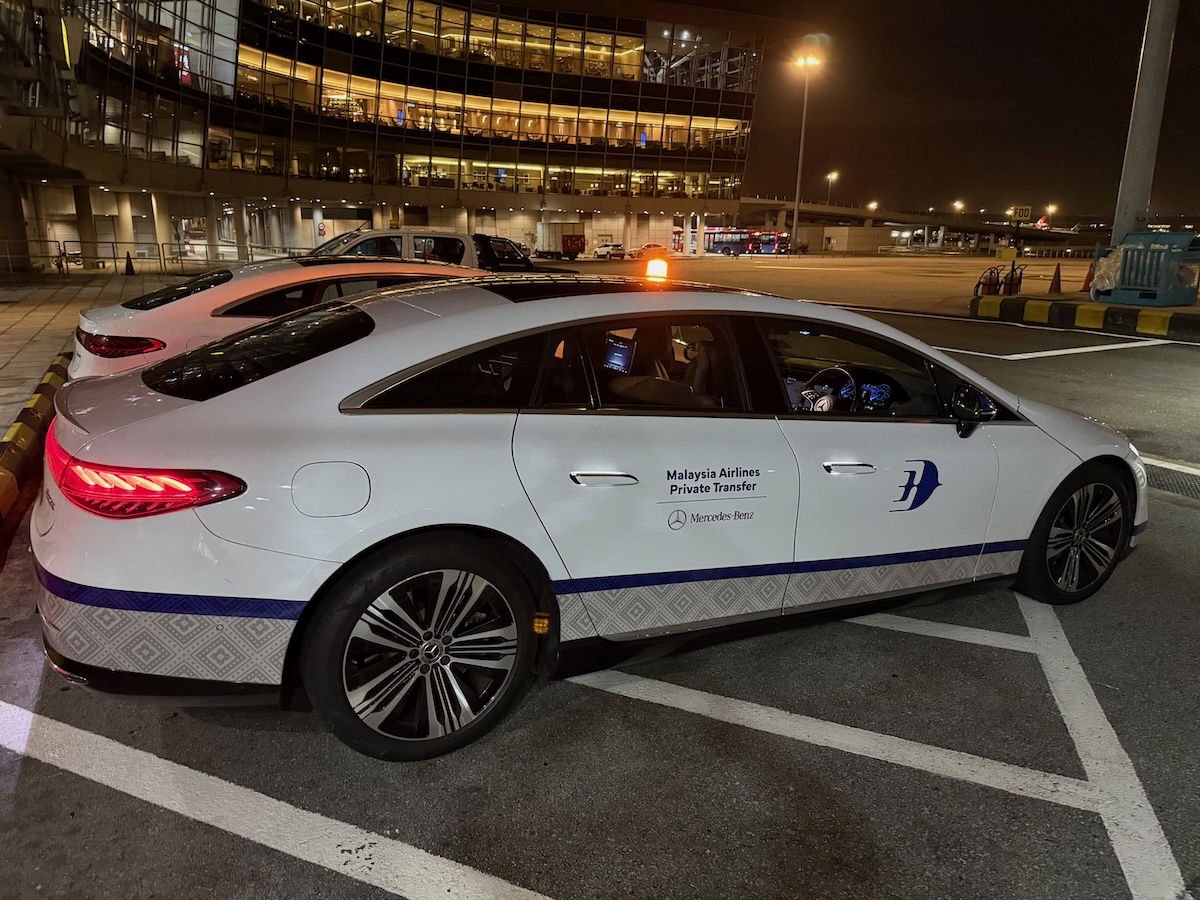 Anyway, the experience was lovely. One Malaysia Airlines employee helped me with my bags and placed them in the trunk, and then another employee drove me across the tarmac, a drive that took around three minutes. He then removed my bags out of the trunk for me. As you’d expect, there was great plane spotting along the way. The car used for this service is the all-electric EQS 500 4MATIC.