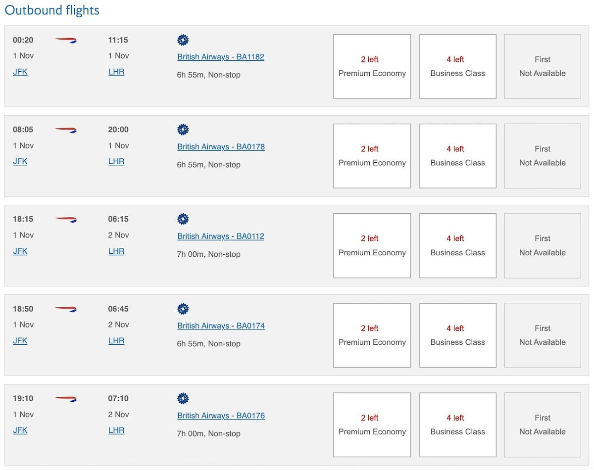 For example, currently the British Airways schedule is open as far out as November 1, 2026. The airline guarantees at least four business class award seats per flight, and if you look at flights for that day, you’ll see that all flights have four business class award seats.
