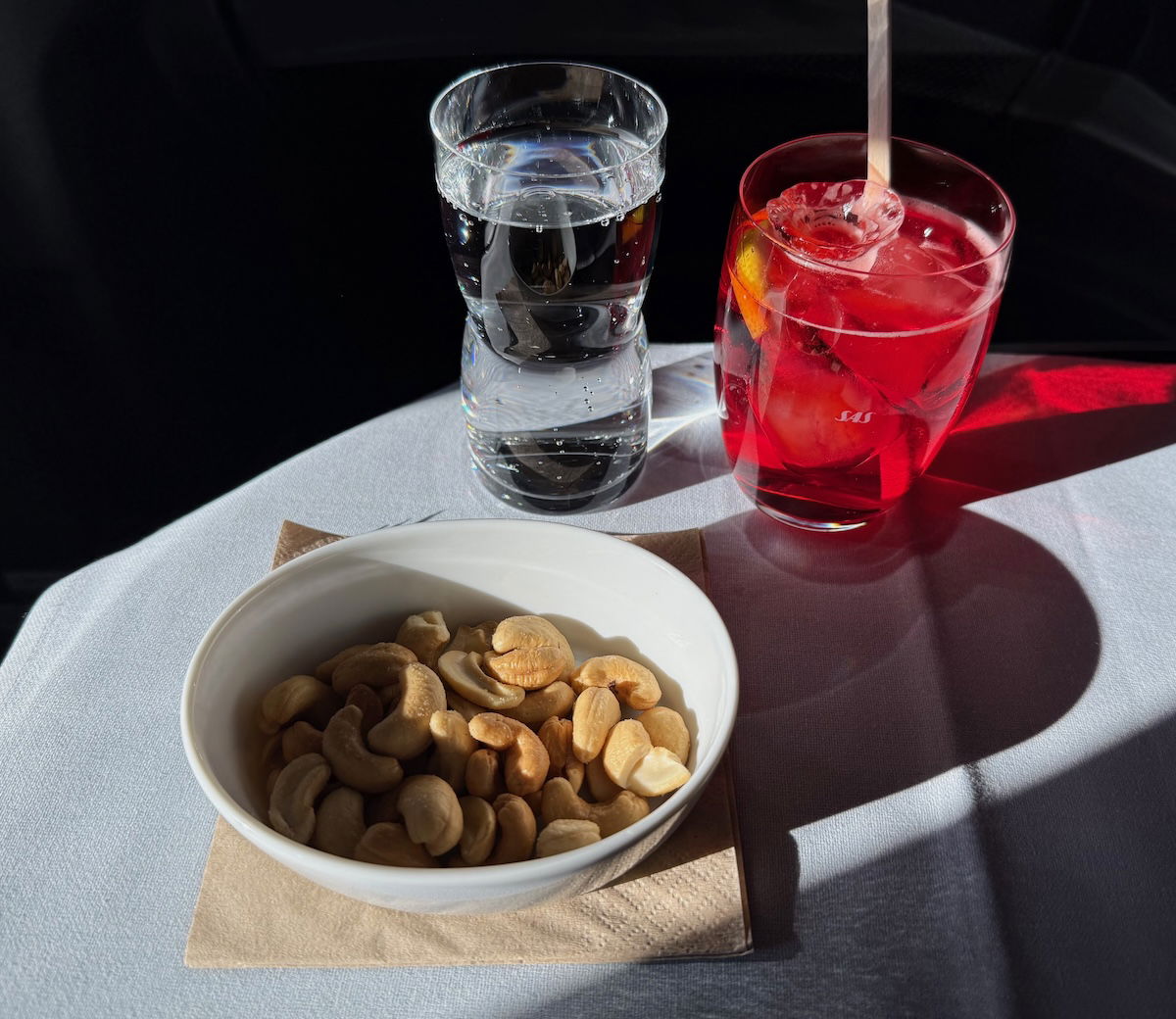 After takeoff, service began with drinks and warm cashews. To drink, I opted for the negroni sbagliato, one of canned drinks that they pour into a glass for you (sorry/you’re welcome for the artsy lighting — I thought the light was so pretty that I just went with it, rather than closing the windows and using the reading light).