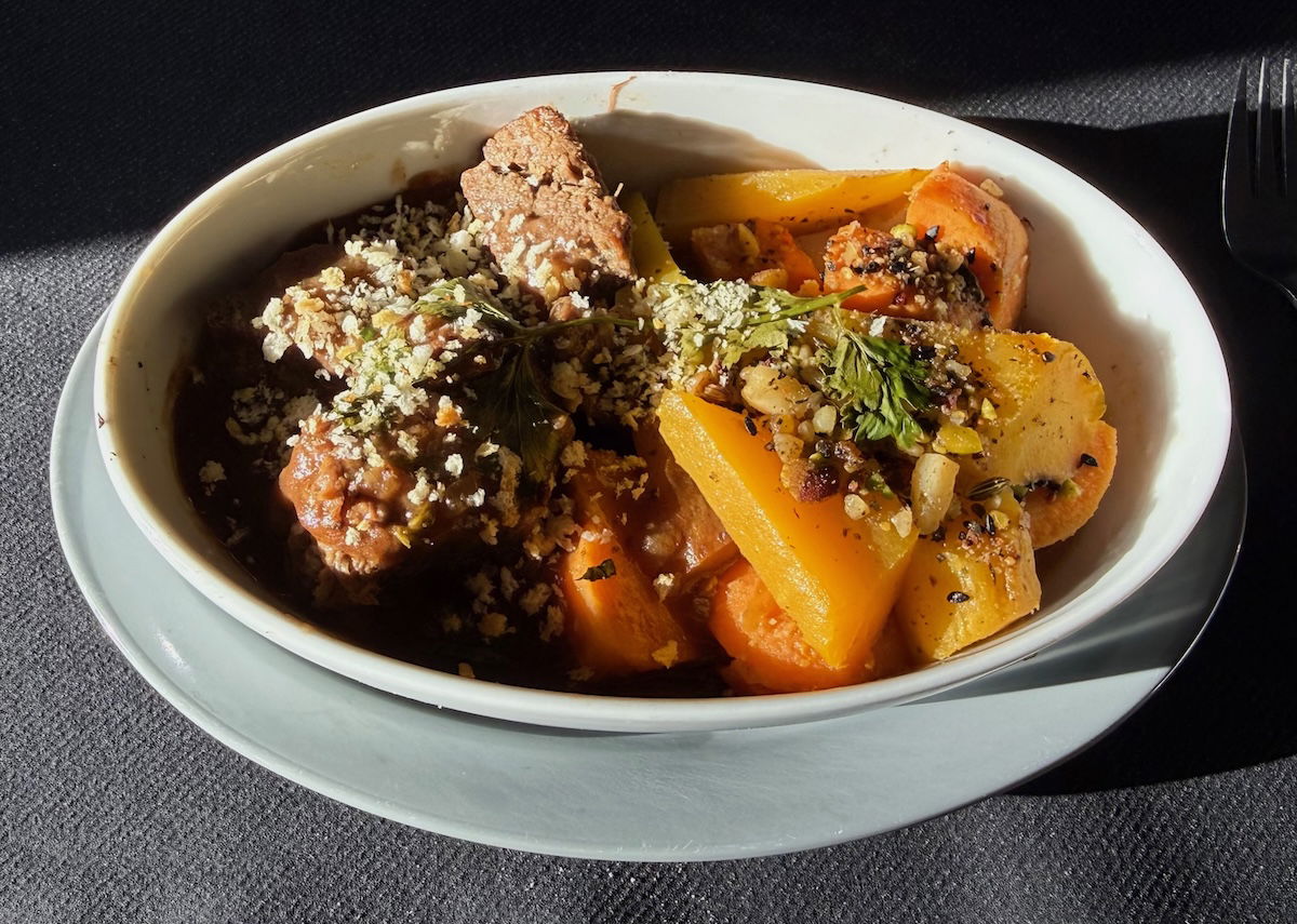 For the main course there were four options, and I ordered the braised beef with demi-glace of dates, salted lemon, honey, carrots, and sweet potato. I almost never order beef on planes, but this was quite good!