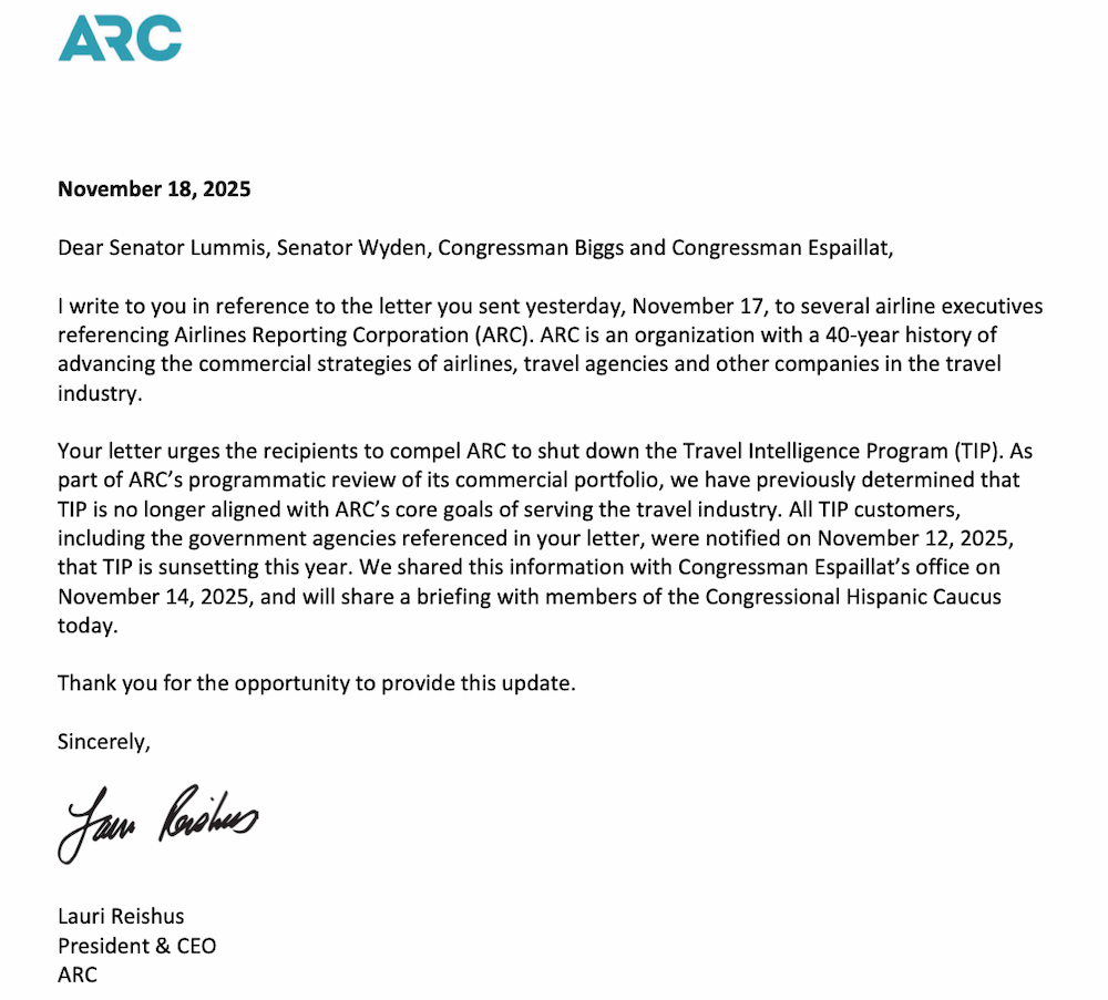 “Your letter urges the recipients to compel ARC to shut down the Travel Intelligence Program (TIP). As part of ARC’s programmatic review of its commercial portfolio, we have previously determined that TIP is no longer aligned with ARC’s core goals of serving the travel industry. All TIP customers, including the government agencies referenced in your letter, were notified on November 12, 2025, that TIP is sunsetting this year.”