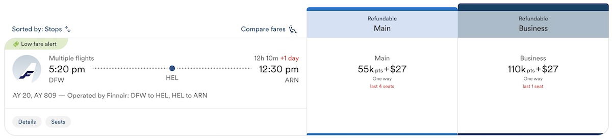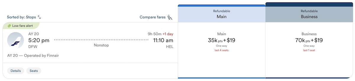 For example, if you want to fly from Dallas (DFW) to Helsinki (HEL) on Finnair, you’ll find pricing is 35,000 points in economy, or 70,000 points in business class, which is what you’d expect, based on the distance of 5,001-7,000 miles.