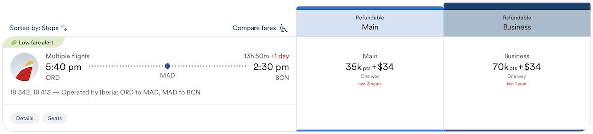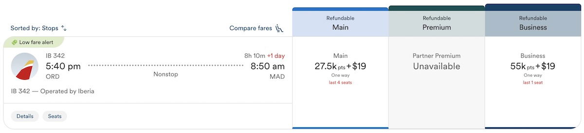 As another example, if you want to fly from Chicago (ORD) to Madrid (MAD) on Iberia, you’ll find pricing of 27,500 points in economy, or 55,000 points in business class, based on the distance of 3,501-5,000 miles.