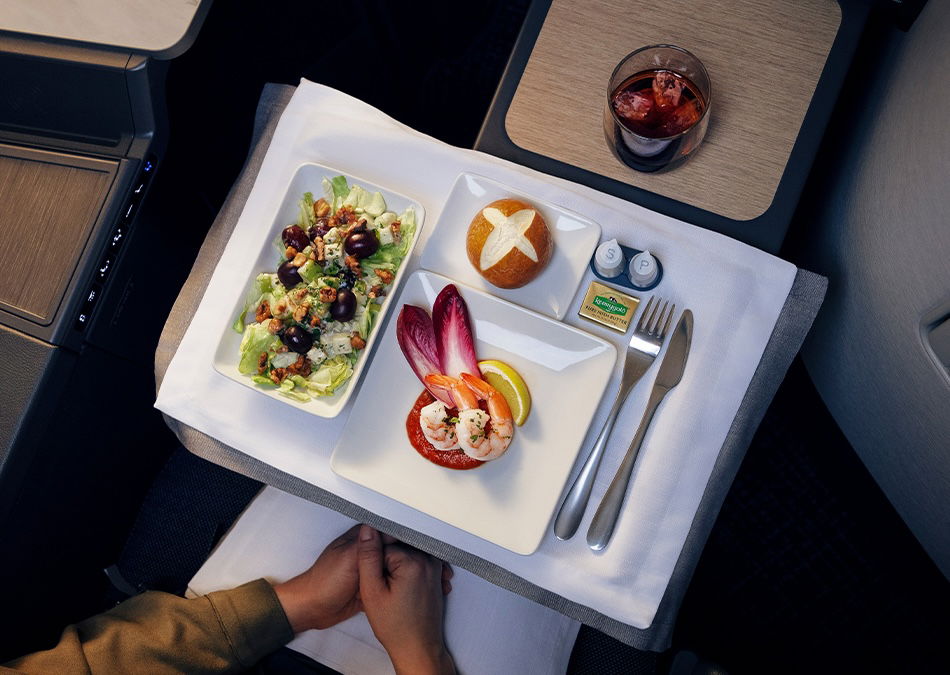 In international and premium transcontinental first and business class, we’ll see “a refined menu inspired by the sophistication of 1920s hotel dining.” In March, the appetizer course will include a classic prawn cocktail and a crisp Waldorf salad, while in April, the appetizer course will include caviar, blinis, and a deviled egg with creme fraiche.