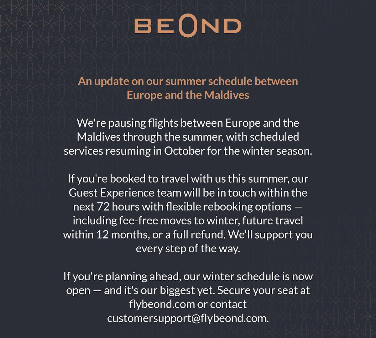 All-business class airline Beond has announced that it’s suspending its flights between the Maldives and Europe for the summer season, though it appears that all flights (including to the Middle East) are cut during that period.