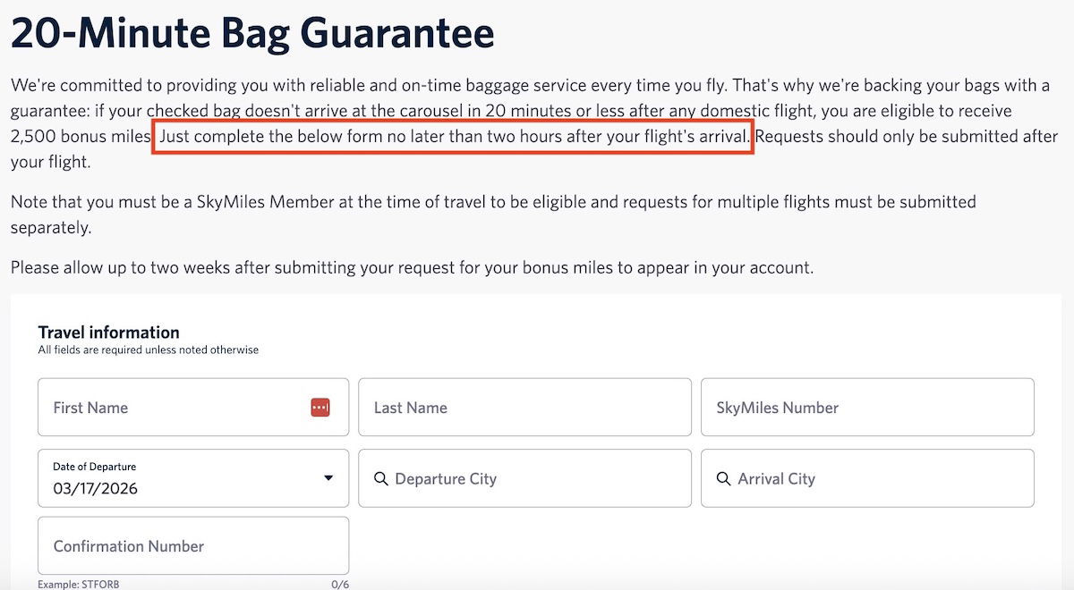 Per an update to the terms, Delta now requires travelers to submit their claim for the 20-minute baggage guarantee within two hours of the flight’s arrival time. As a point of comparison, previously you had up to 72 hours, so Delta shortened the window by around 97%… no biggie, right? 😉