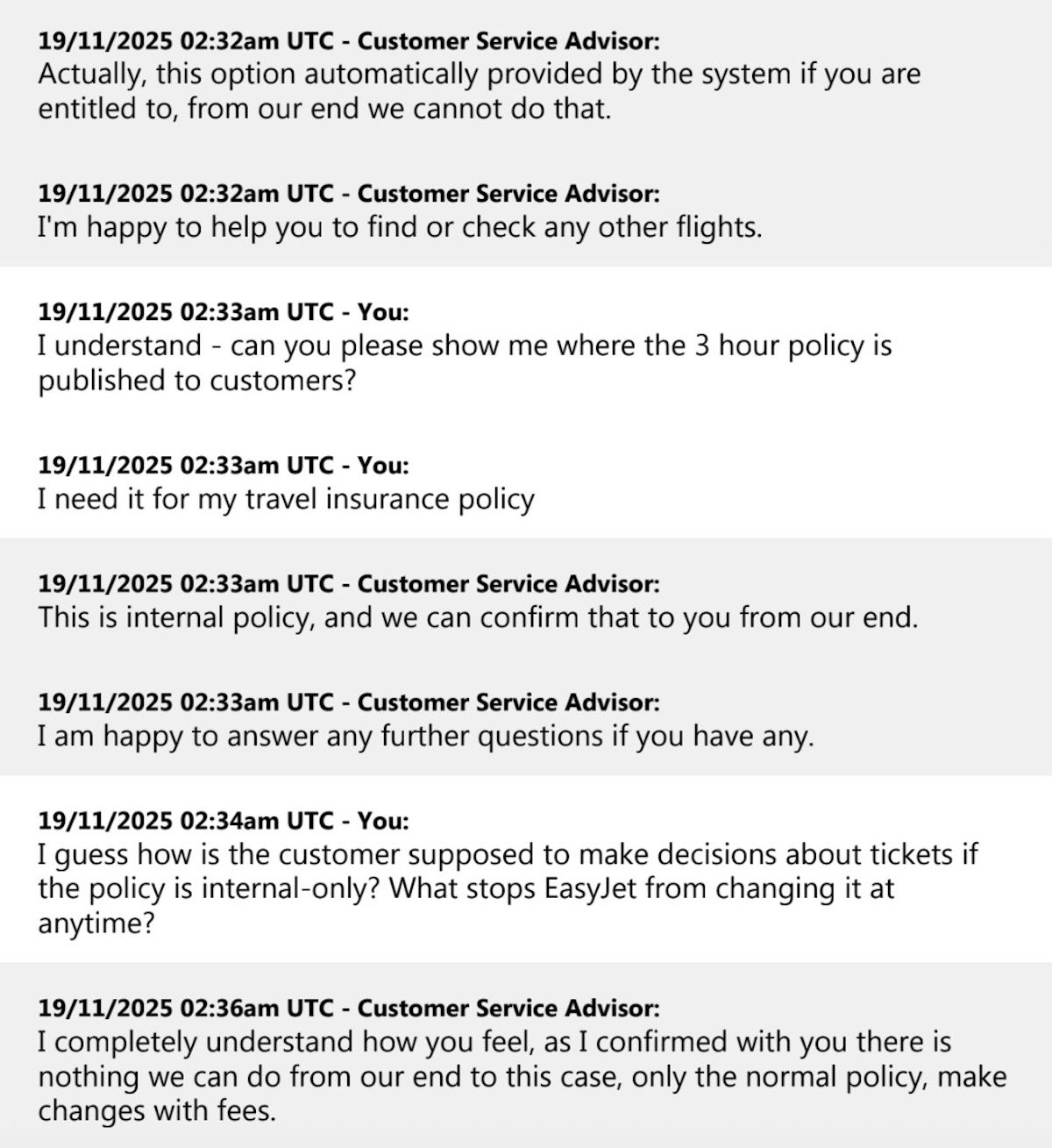 For what it’s worth, below is part of Mike’s chat with the EasyJet customer service representative.