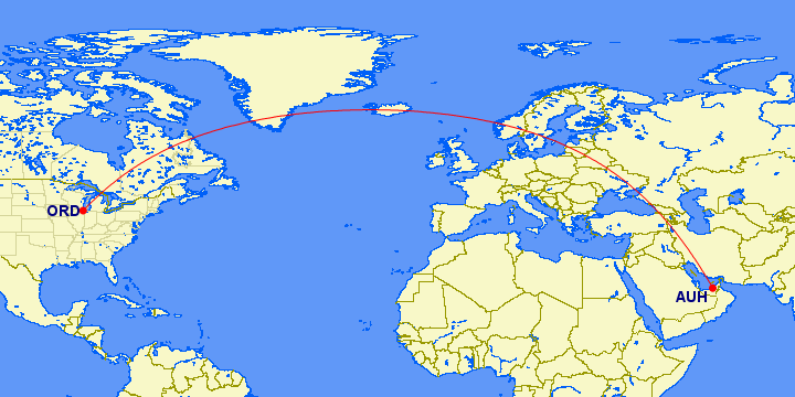 EY12 Chicago to Abu Dhabi departing 9:10PM arriving 7:40PM (+1 day)