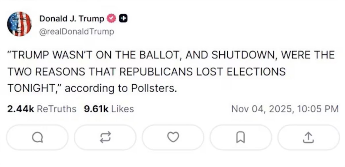 - Following yesterday’s elections (a victory for Democrats), Trump blamed the loss of Republicans partly on the government shutdown; that suggests that he acknowledges that the shutdown continuing is worse for Republicans than for Democrats